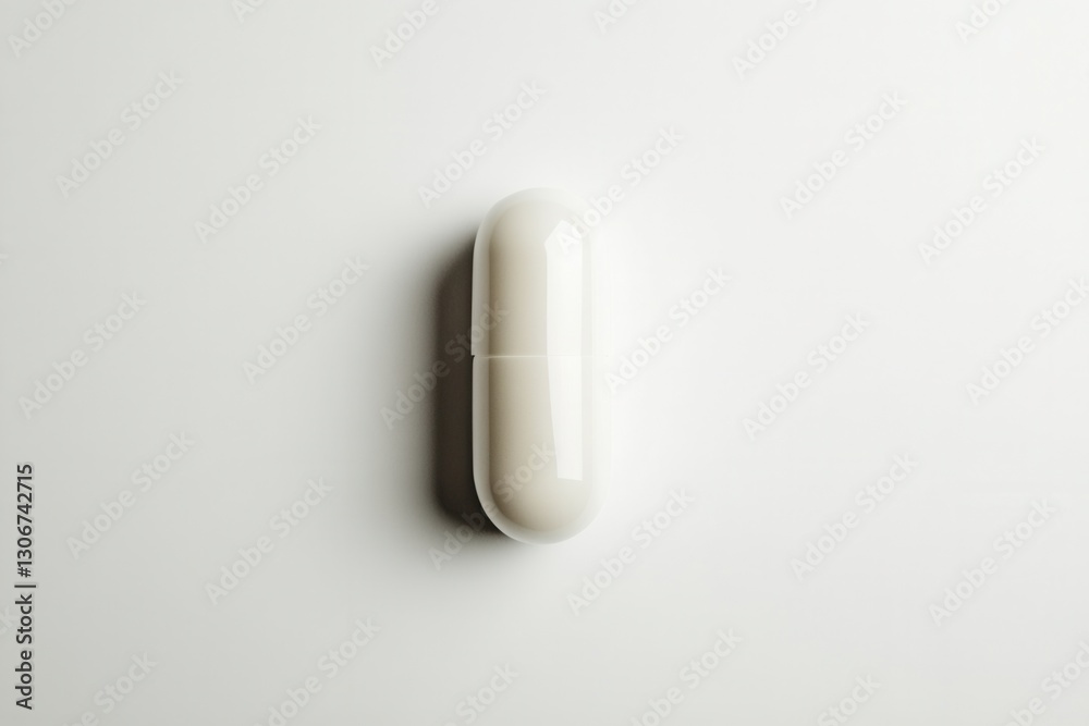 The watermark will not be included on Wall mural.: Single white capsule centered on a minimalist background with soft shadows and hyper realistic detai