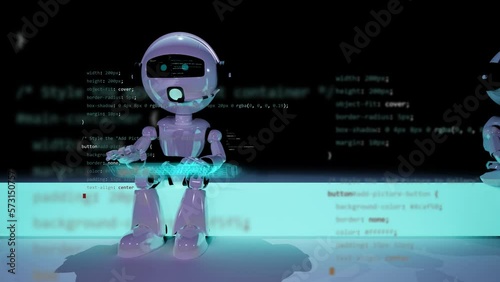 The watermark will not be included on Wall mural.: Siting robot on neon light with working on code programming web site on virtual hud interface keyboa