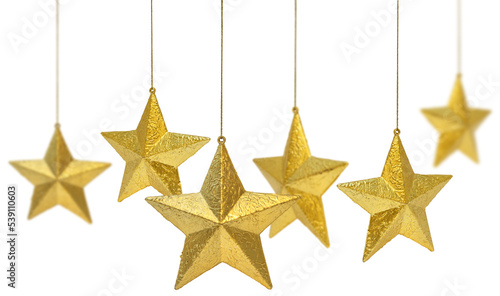 Wall mural : Six golden christmas decoration stars hanging isolated