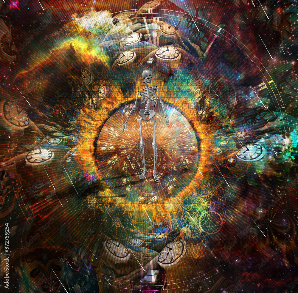 Wall mural skeleton and flow of time. surreal art. 3d rendering
