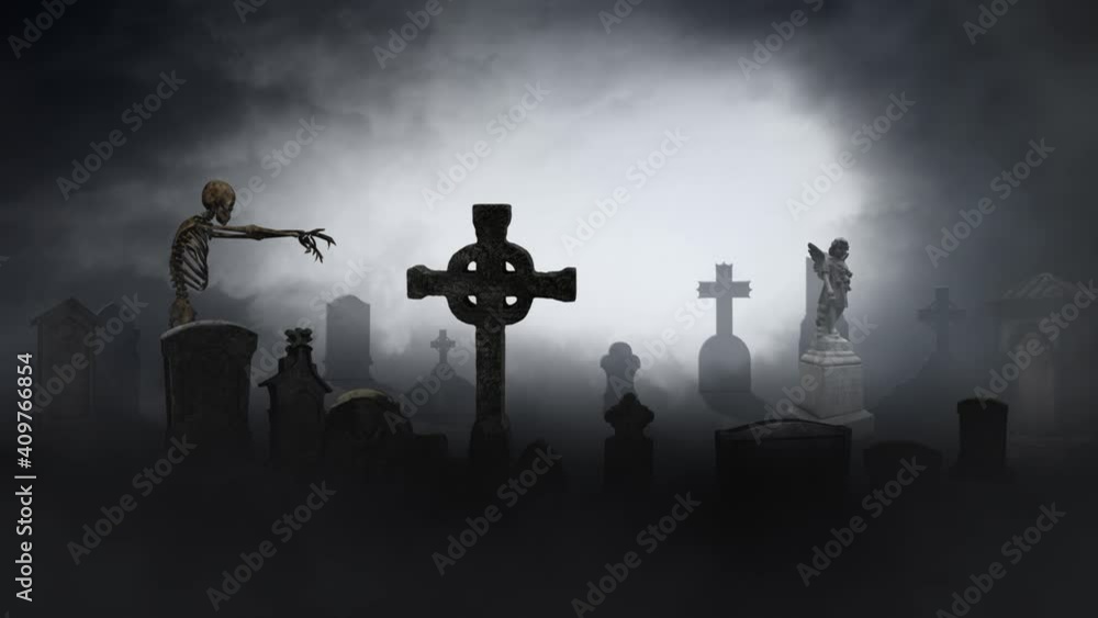 Wall mural skeleton walking through a misty graveyard 4k loop features a misty graveyard and a zombie-like skel - Wall murals Wall mural skeleton walking through a misty graveyard 4k loop features a misty graveyard and a zombie-like skel - Wall murals
