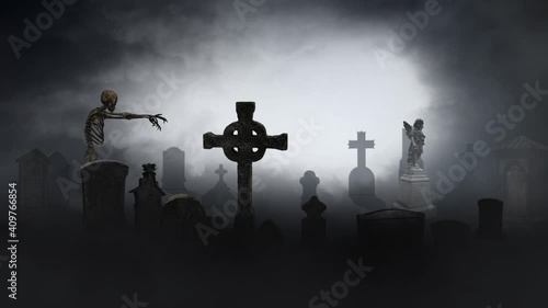Wall mural : Skeleton walking through a misty graveyard 4k loop features a misty graveyard and a zombie-like skel