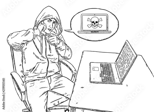 Wall mural : Sketch style illustration of hacker talking on mobile phone and pointing at viewer