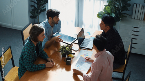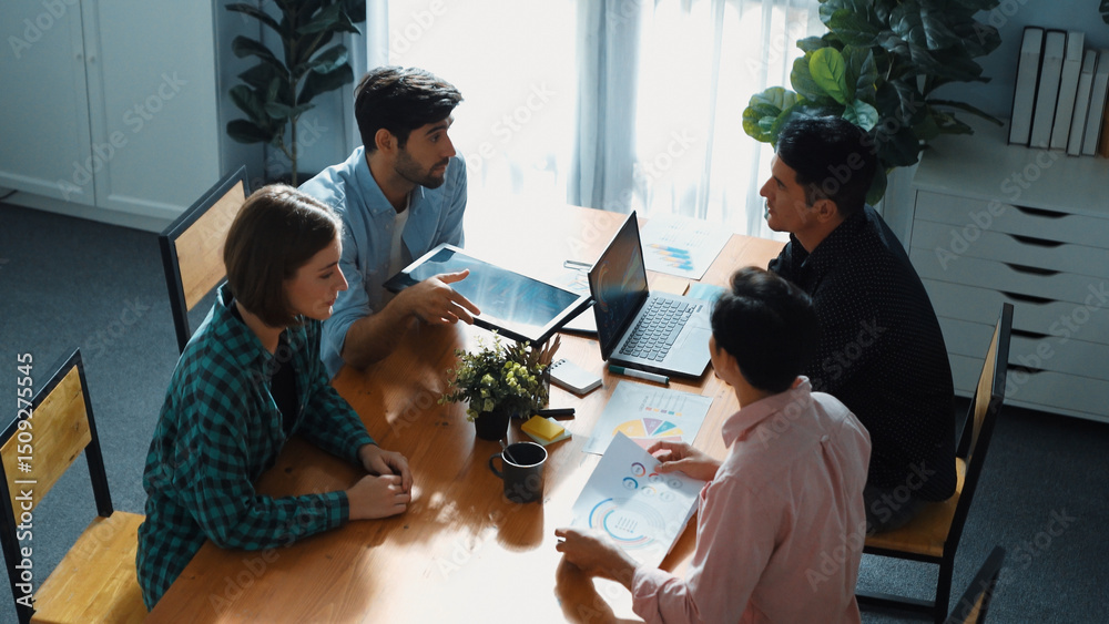 The watermark will not be included on Wall mural.: Skilled project manager walking at table while colleague brainstorm idea - business team working toge