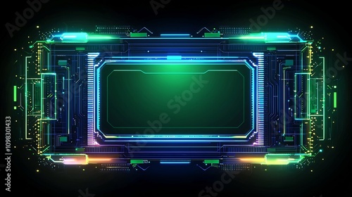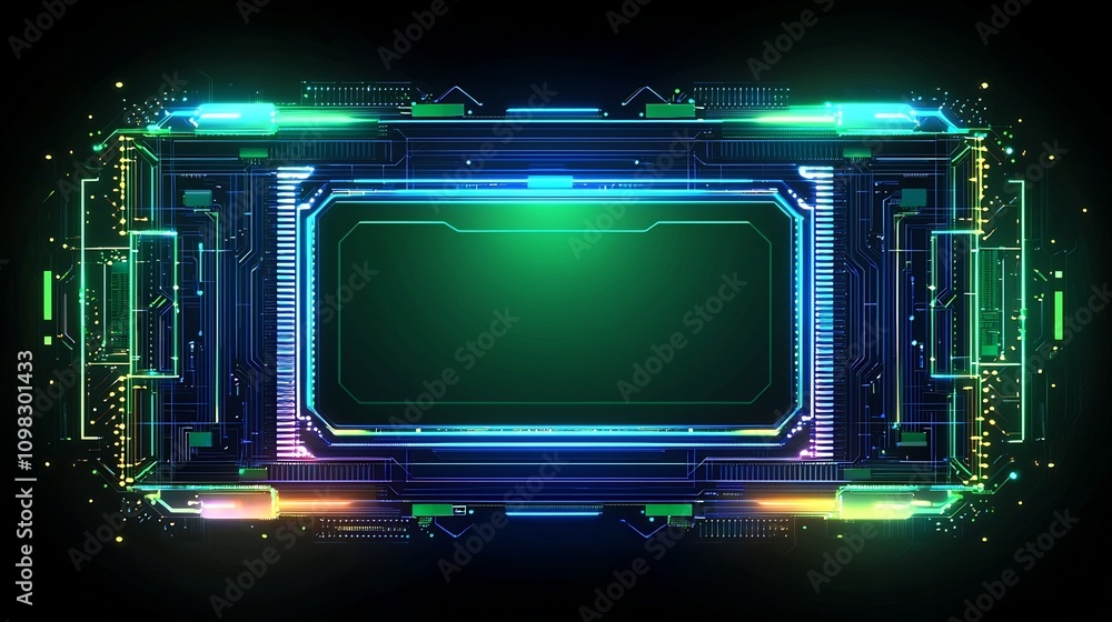 Wall mural : Sleek and innovative abstract blue and green technology circuit background with chip and open text a