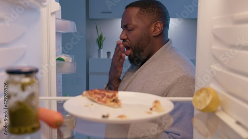 Sleepy man opening the empty refrigerator and looking inside searching for something to eat - view frWall mural