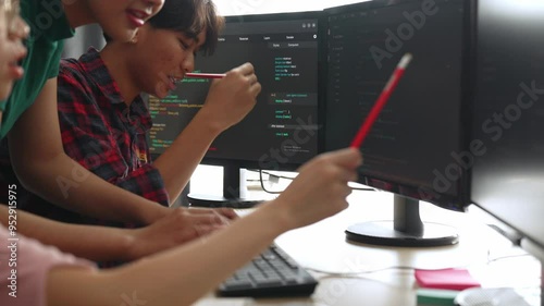 Wall mural : Slow motion back end software developer engineer for computer programming working together on debugg