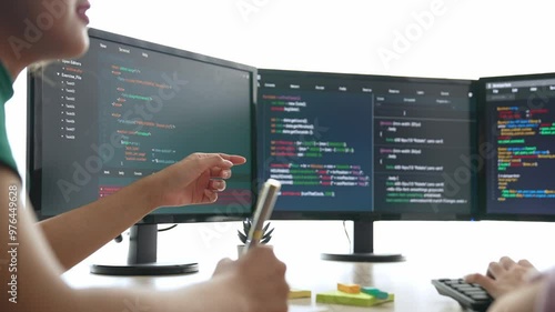 Wall mural : Slow motion back end software developer engineer for computer programming working together on debugg
