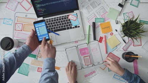 The watermark will not be included on Wall mural.: Small team of ux designers discussing app wireframe