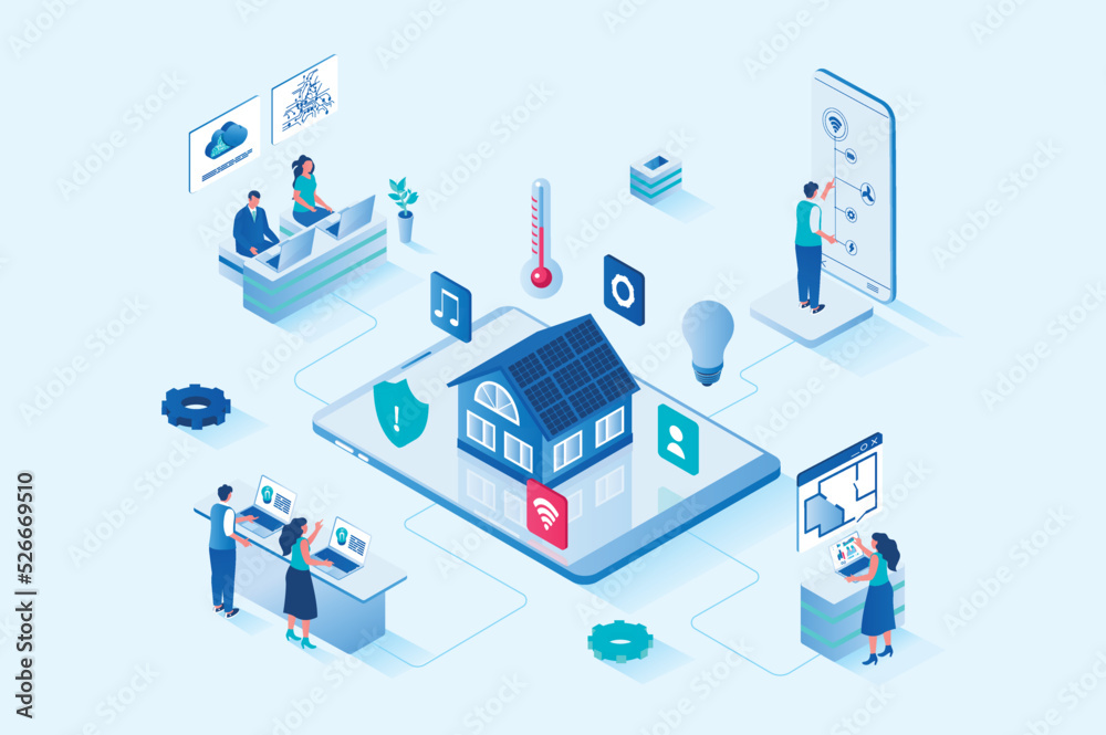 Wall mural smart home 3d isometric web design. people monitor and control sensors in house from mobile applicat - Wall murals Wall mural smart home 3d isometric web design. people monitor and control sensors in house from mobile applicat - Wall murals