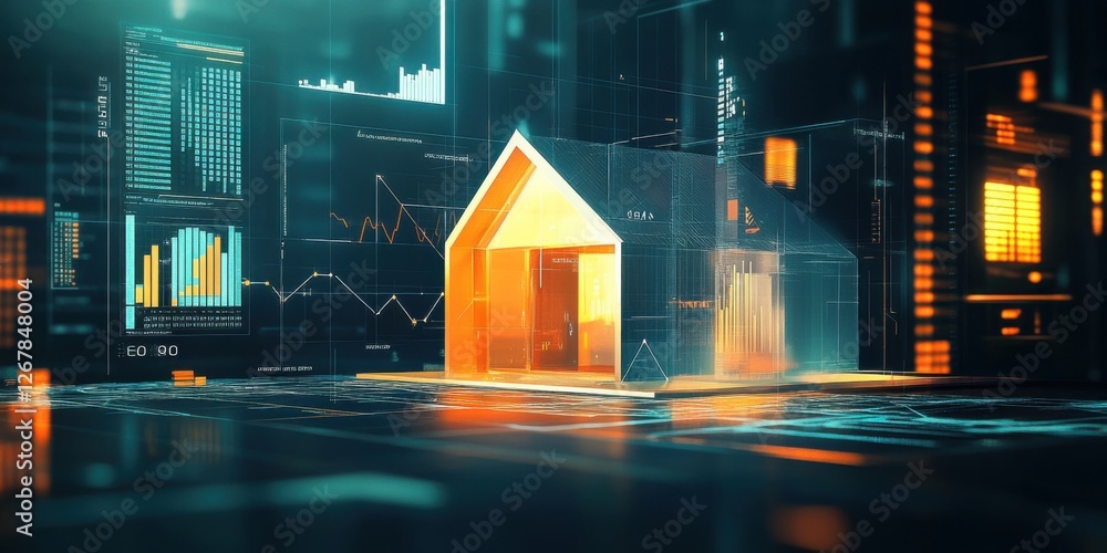 Wall mural smart home technology futuristic digital house model with data visualization and network connections - Wall murals Wall mural smart home technology futuristic digital house model with data visualization and network connections - Wall murals