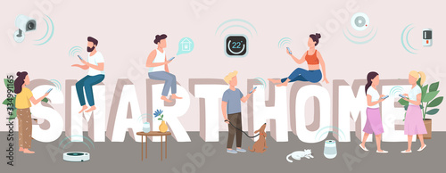 Wall mural smart home word concepts flat color vector banner. typography with tiny cartoon characters. internet