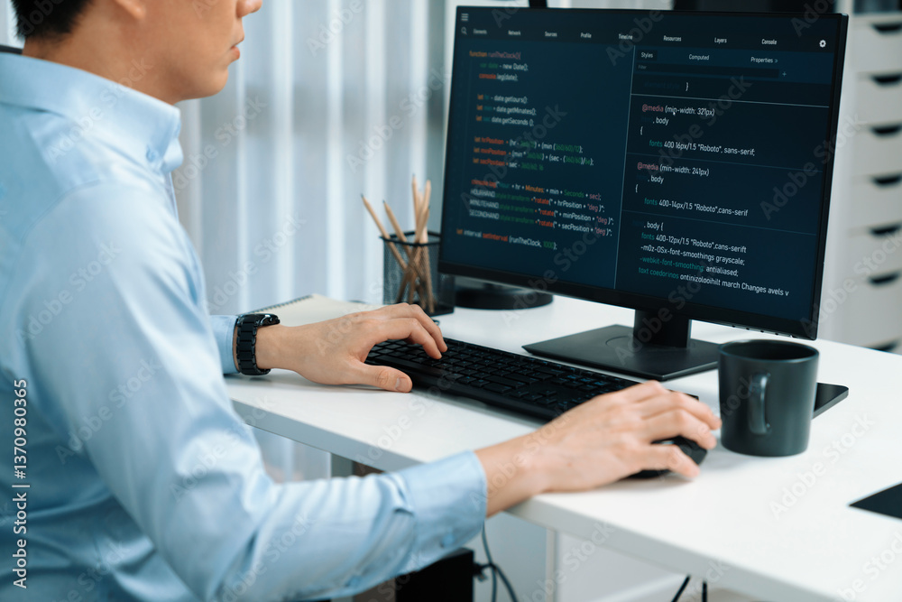 The watermark will not be included on Wall mural.: Smart it developer looking at coding program application on computer screen of online website, analy