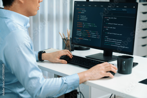 Wall mural : Smart it developer looking at coding program application on computer screen of online website, analy