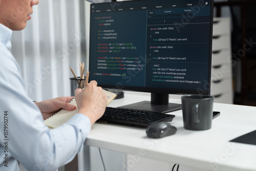 Wall mural : Smart it developer looking at coding program application on computer screen of online website, analy