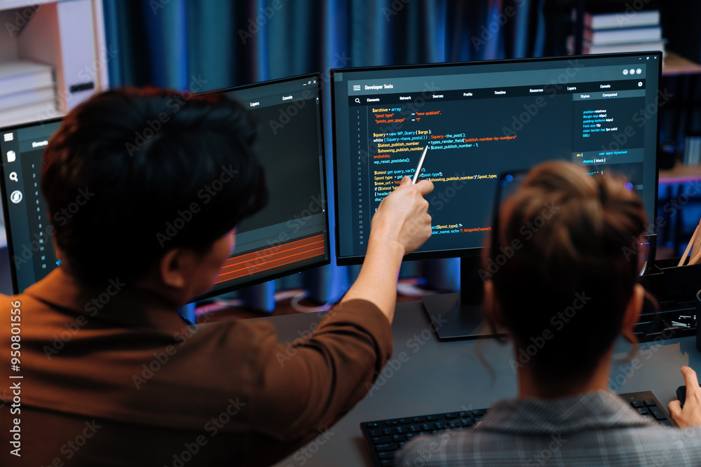 The watermark will not be included on Wall mural.: Smart it developer looking at coding program application on computer screen of online website at bac