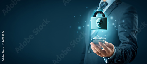 Wall mural : Smart phone face detection and identification (id) concept - padlock with face is metaphor of unlocki