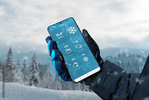 The watermark will not be included on Wall mural.: Smart phone in hand with glove with weather app on display - winter, snowing time - online service wit