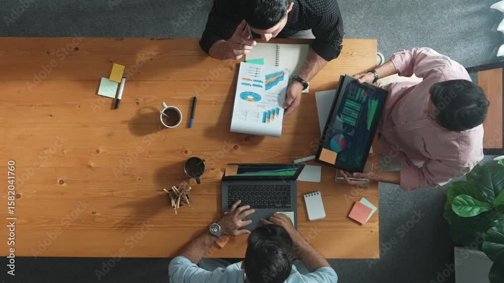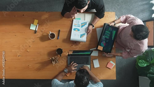 The watermark will not be included on Wall mural.: Smart project manager calling phone while diverse team brainstorm idea and looking at financial stat