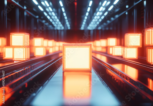 Wall mural smart warehouse with glowing digital cube boxes. future concept of supply chain and logistic busines - Wall murals Wall mural smart warehouse with glowing digital cube boxes. future concept of supply chain and logistic busines - Wall murals