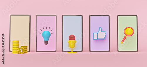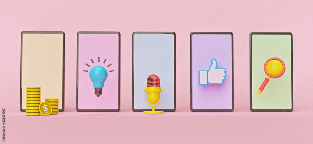 Wall mural smartphone apps concept design. minimal style symbols. horizontal banner. 3d rendering