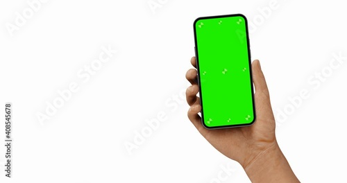 Wall mural : Smartphone blank screen in hand enters dynamically the camera frame from right - animation best qual
