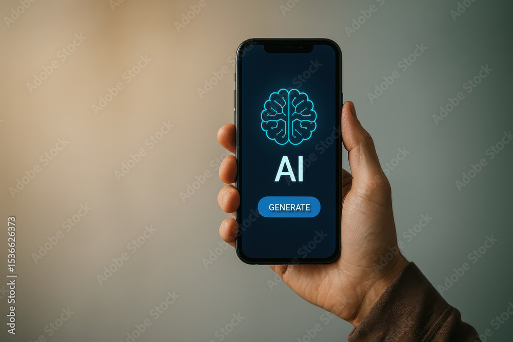 Wall mural smartphone displaying ai interface with brain graphic and generate button, symbolizing technology an - Wall murals Wall mural smartphone displaying ai interface with brain graphic and generate button, symbolizing technology an - Wall murals