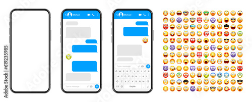 The watermark will not be included on Wall mural.: Smartphone messaging app, user interface design with emoji - SMS text frame - Chat screen with blue message bubbles - Texting app for communication - Social media application - Vector illustration