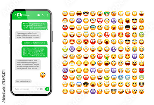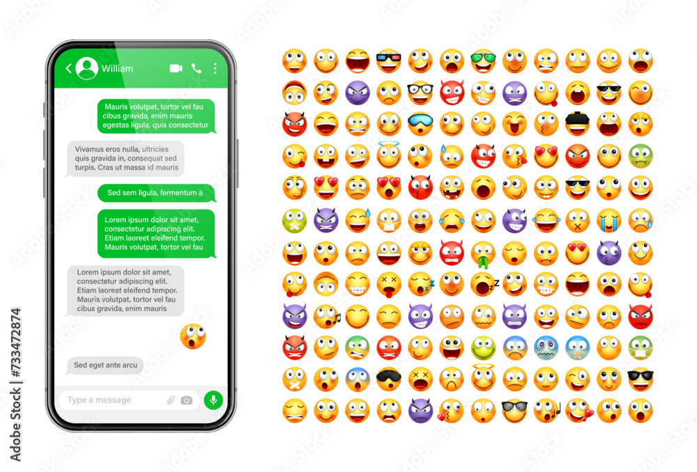 Wall mural : Smartphone messaging app, user interface design with emoji - sms text frame - chat screen with green m