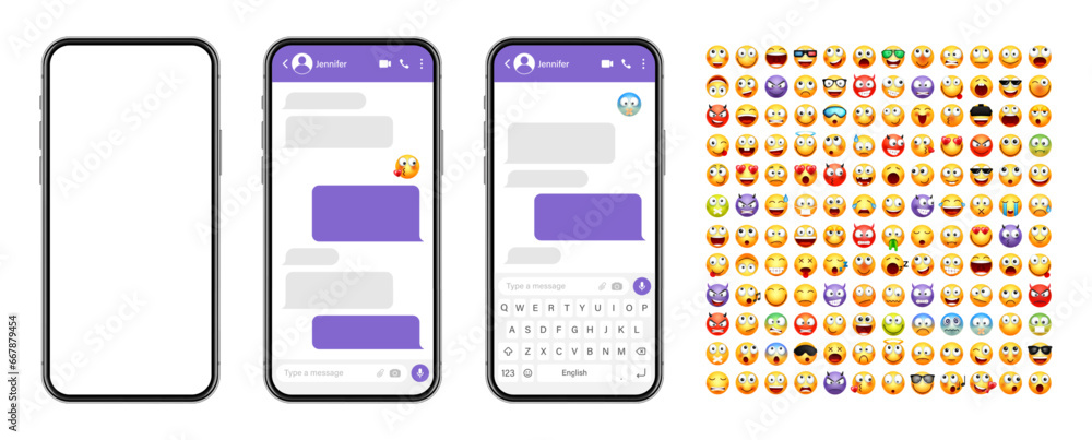 The watermark will not be included on Wall mural.: Smartphone messaging app, user interface design with emoji - sms text frame - chat screen with violet