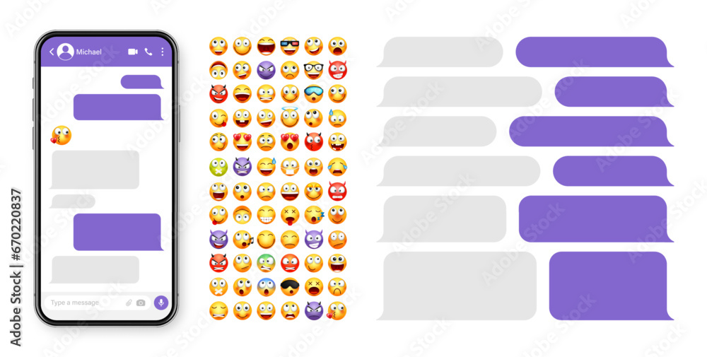 The watermark will not be included on Wall mural.: Smartphone messaging app, user interface design with emoji - sms text frame - chat screen with violet