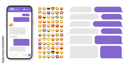 Wall mural smartphone messaging app, user interface design with emoji. sms text frame. chat screen with violet