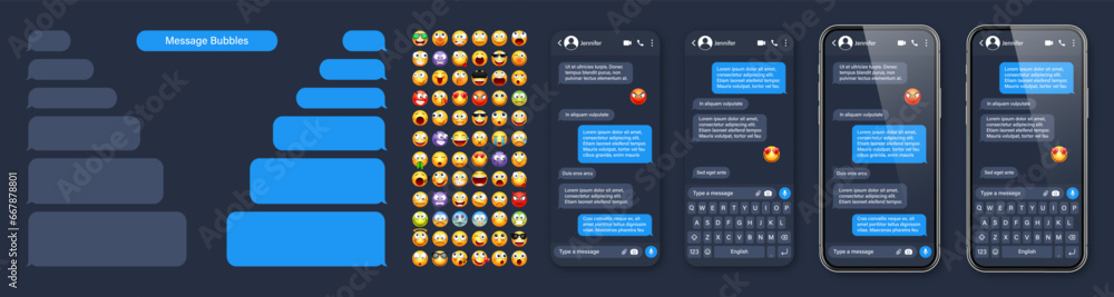 Wall mural smartphone messaging app, user interface with emoji. sms text frame. chat screen, blue message bubbl - Wall murals Wall mural smartphone messaging app, user interface with emoji. sms text frame. chat screen, blue message bubbl - Wall murals