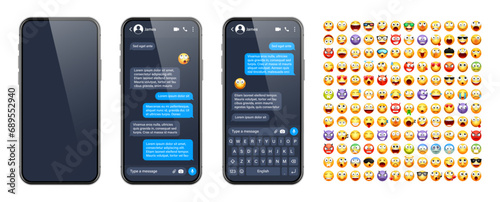 Wall mural smartphone messaging app, user interface with emoji. sms text frame. chat screen, blue message bubbl