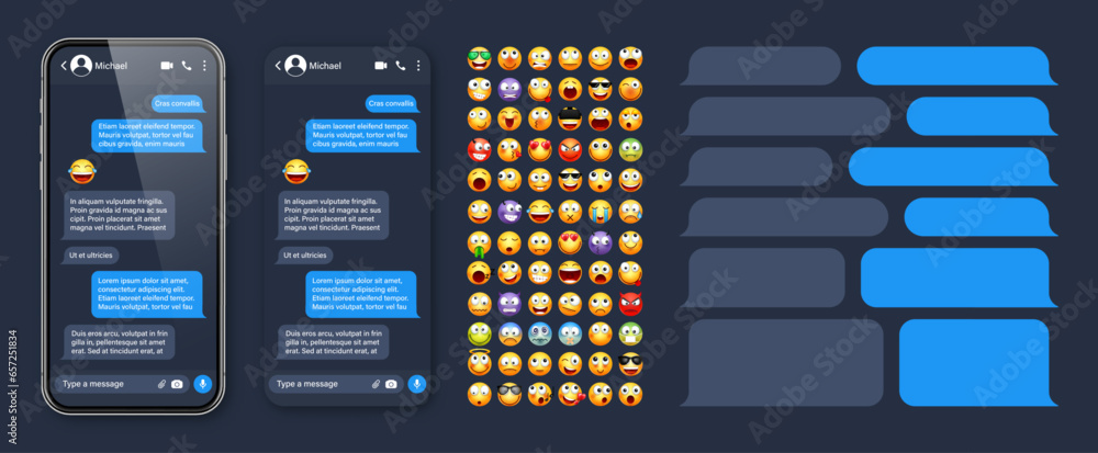 Wall mural smartphone messaging app, user interface with emoji. sms text frame. chat screen, blue message bubbl - Wall murals Wall mural smartphone messaging app, user interface with emoji. sms text frame. chat screen, blue message bubbl - Wall murals