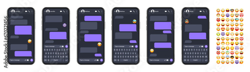 Wall mural smartphone messaging app, user interface with emoji. sms text frame. chat screen, violet message bub