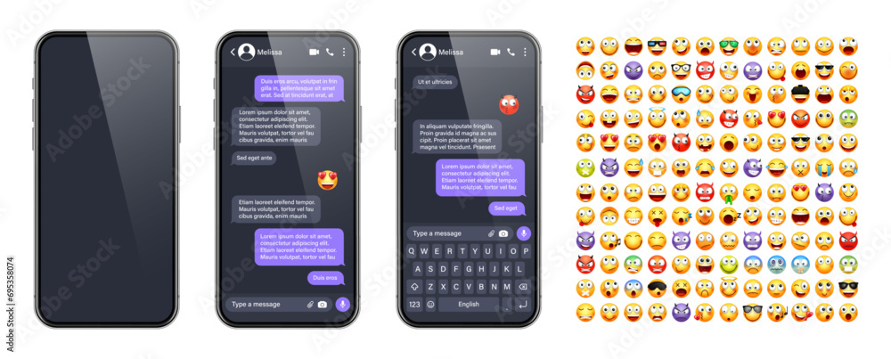 Wall mural smartphone messaging app, user interface with emoji. sms text frame. chat screen, violet message bub - Wall murals Wall mural smartphone messaging app, user interface with emoji. sms text frame. chat screen, violet message bub - Wall murals