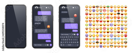 Wall mural : Smartphone messaging app, user interface with emoji - sms text frame - chat screen, violet message bub
