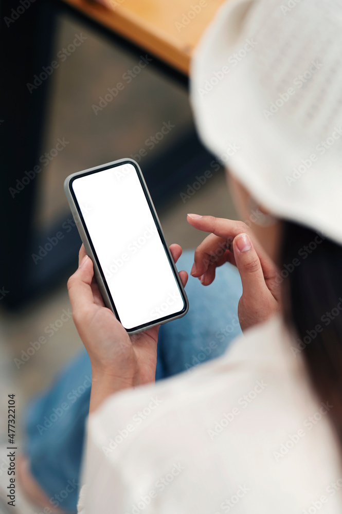 Wall mural : Smartphone mockup - closeup of woman using mobile phone with empty screen at co-workspace -