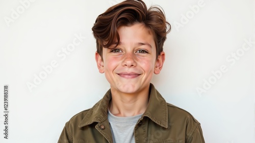 The watermark will not be included on Wall mural.: Smiling boy in casual attire captures joy and innocence against a simple background