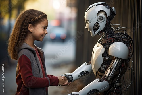 Wall mural smiling cute little girl looking at robot in the street. a child interacting with a friendly robot.