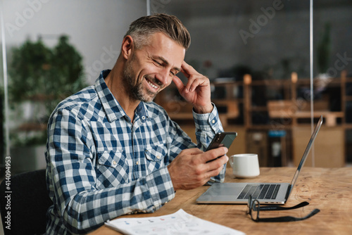 Wall mural smiling grey man using mobile phone while working with laptop