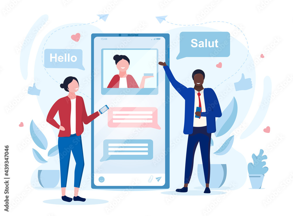 Wall mural smiling male and female characters are texting using mobile application on smartphone