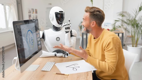 Wall mural smiling mature man in yellow sweater teaches robot to draw signature at modern workspace. white huma