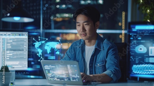 Wall mural : Smiling young asian it developer typing on a laptop, surrounded by coding program data on two screen