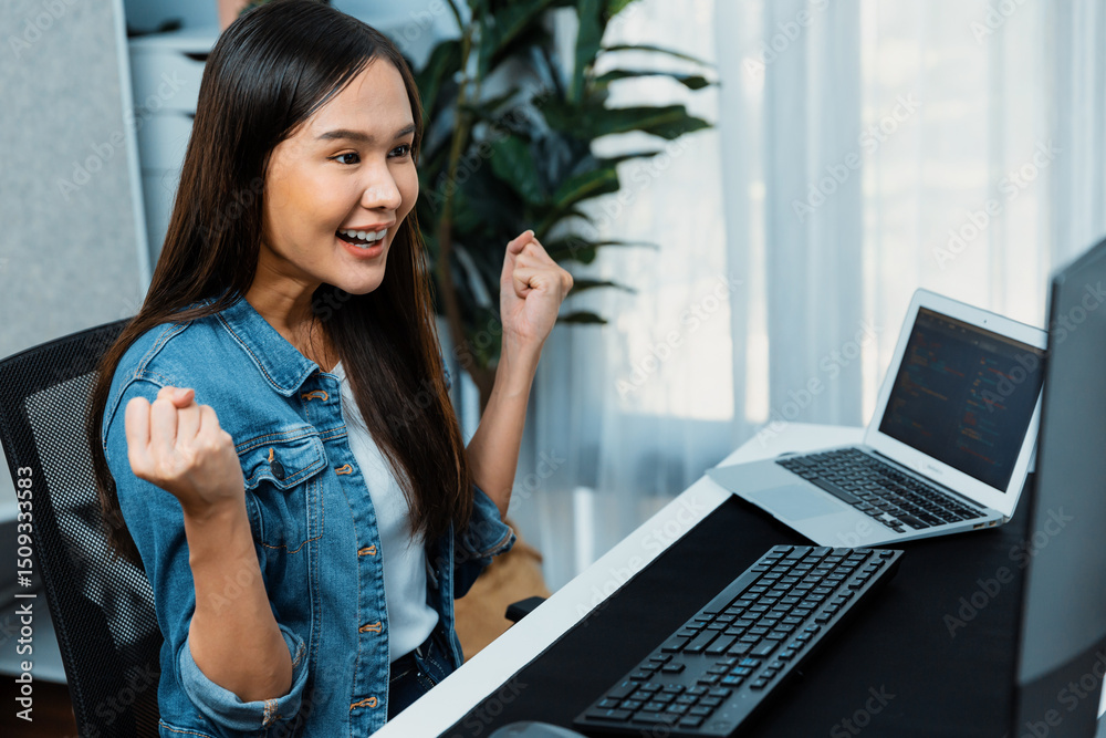 Wall mural smiling young asian it developer with happy face getting new software development information projec