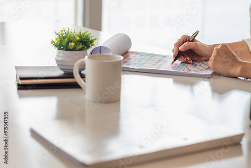 Wall mural smooth focus, group of web designers are working together to develop mobile responsive website with
