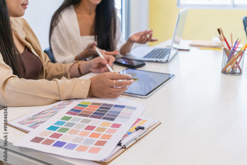 Wall mural smooth focus, group of web designers are working together to develop mobile responsive website with