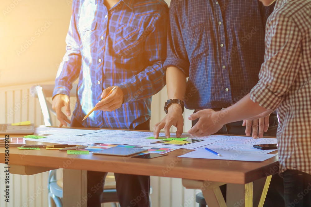 Wall mural : Smooth focus, group of web designers are working together to develop mobile responsive website with