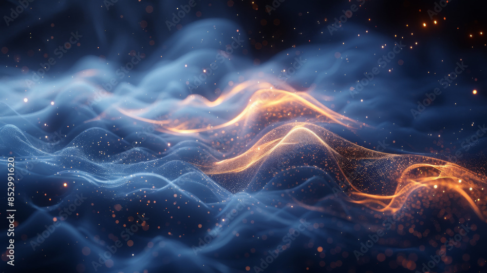 The watermark will not be included on Wall mural.: Smooth smoke particle wave, big data techno background with glowing dots, hi-tech concept, blue colo